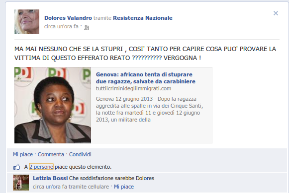 Nei giorni scorsi, Dolores Valandro, consigliera di quartiere della Lega Nord a Padova, dopo aver letto la notizia di un tentativo di stupro fatto da due immigrati nei confronti di una donna ha postato su Fb la notizia commentando “Ma mai nessuno che se la stupri?”  riferendosi alla ministra per l’integrazione Cecile Kienge. Alla ministra va tutta la solidarietà ed il sostegno per gli attacchi da parte di politici della Lega Nord fatti con dichiarazioni oppure  sul web da quando ha ricevuto la nomina.  La solidarietà le è stata manifestata anche dall’associazione nazionale D.i.RE  Donne in Rete contro la violenza.