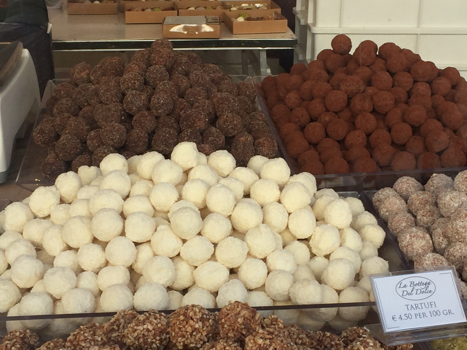 Sto andando in posta a fare una raccomandata e attraversando piazza del Popolo, come sempre assorta nelle incombenze del lavoro, vengo investita dal delicato profumo di cacao. Alzo lo sguardo e vedo bancarelle cariche di promesse al cioccolato. Stecche al fondente e alla nocciola, aromatizzate da scorze d’arancia, di limone o alla cannella, confetti al cioccolato bianco, al latte, fondente e ancora, ripieni di nocciola, mandorla o di gocce di ruhm, eppoi le vedo: le promiscue praline. Delizia del palato: cioccolato che si accoppia senza alcun pudore al cocco, al pistacchio, alla nocciola e anche al caffè.
