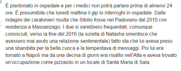 Carlo Bellotto su il Mattino di Padova infila però una perla dietro l’altra: ha la squisita sensibilità di definire la vittima, “la bella cuoca“, riferisce che gli inquirenti stanno indagando se Natasha Bettiolo avesse ricevuto telefonate e messaggi, allude nel titolo a molestie e pressioni che la donna potrebbe aver subito prima di essere uccisa, eppure non fa alcun riferimento allo stalking.