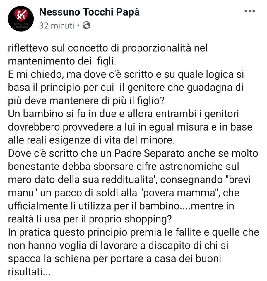 Un paio di giorni or sono, sulla pagina facebook di Nessuno Tocchi Papà è stato pubblicato questo post