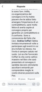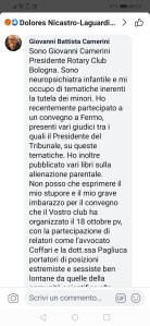 Il professore oggi spiega; “La mia segnalazione riportata nell’articolo si rivolgeva al Rotary che aveva non sponsorizzato ma organizzato l’evento, connotandosi a mio giudizio l’evento stesso come contrario all’etica che le iniziative rotariane sono tenute a rispettare. Il Distretto al quale il Club di Montegranaro appartiene ha deciso di conseguenza . Rilevo solo che indicare come “truffa” la alienazione parentale, come recitava il titolo di uno dei relatori, significa indicare come “truffatori” coloro che se ne occupano. L’etica rotariana non lo ammette“. Eppure nei suoi commenti (screenshoot) scritti sulla pagina del Rotary di Montegranaro attaccava l’avvocato Coffari personalmente, per la sua professione forense (in qualità di difensore di Claudio Foti) e per le sue opinioni sulla AP, andando ben oltre la questione del titolo.