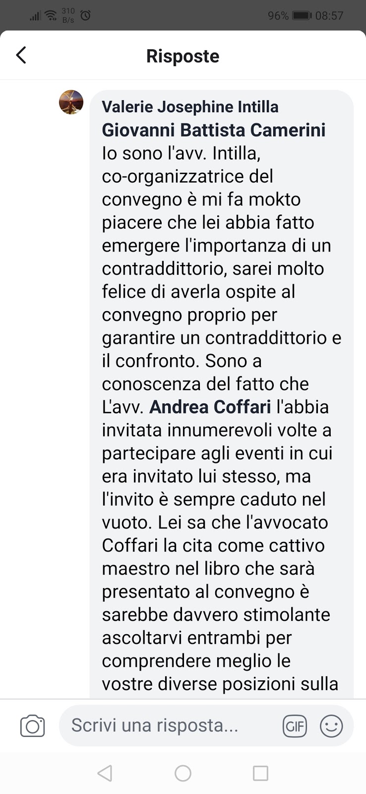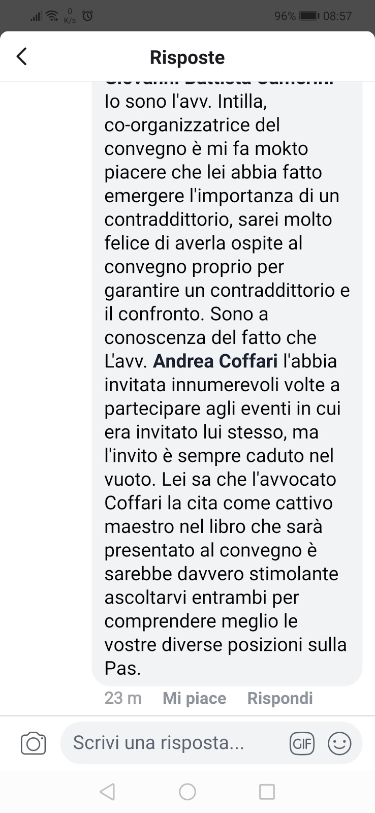 Valerie Josephine Intilla, responsabile del Movimento per l’Infanzia per le Marche, aveva collaborato alla realizzazione dell’evento e ha spiegato durante una breve intervista per il post sul Fatto quotidiano che “è grave che tutto sia stato annullato perché l’avvocato Andrea Coffari non era più persona gradita. Questo è avvenuto dopo che Giovan Battista Camerini si è presentato come presidente del Rotary di Bologna e ha fatto alcuni feroci commenti sulla pagina dello stesso Club che promuoveva l’evento. Insomma, ha fatto pesare il suo ruolo di presidente del Rotary di Bologna e questo è davvero spiacevole. Il convegno si terrà comunque in un’altra sede e inviterò il professor Camerini a confrontarsi con chi critica il costrutto della Ap”.