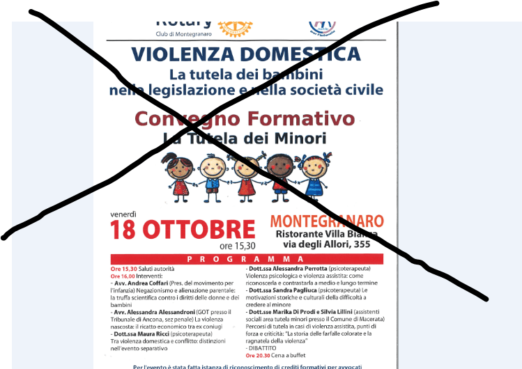 Il 18 ottobre scorso si sarebbe dovuto tenere a Montegranaro (Marche) il convegno Violenza domestica – la tutela dei bambini nella legislazione civile. Tra i relatori Andrea Coffari, avvocato e presidente del Movimento per l’Infanzia con l’intervento sul Negazionismo e alienazione parentale: la truffa scientifica contro donne e bambini. L’iniziativa aveva ottenuto il Patrocinio del Comune di Montegranaro, del Rotary – Distretto 2090 e la concessione dei crediti formativi dall’Ordine degli Avvocati di Fermo.