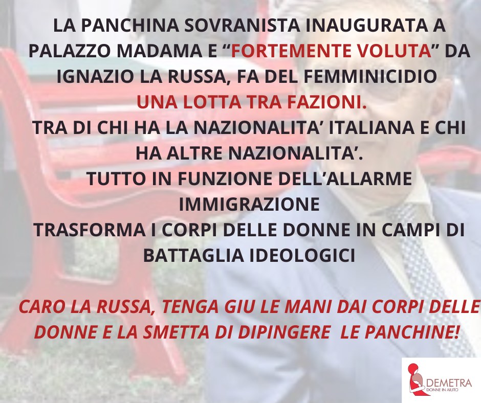 Apparentemente fare di un problema una questione che riguarda tutte e tutti, sembrerebbe una cosa positiva. Già. Lo vuole il movimento delle donne da anni ma che cosa c’entra il tricolore? Qual è il messaggio sottinteso se non identificare con la nazionalità italiana, un simbolo contro la violenza alle donne? Trasformando una lotta politica in una competizione tra squadre: quella di chi nasce con la nazionalità italiana contro altre nazionalità. Annalisa Cuzzocrea, nel suo podcast DayTime, ha definito sovranista la panchina tricolore di Ignazio La Russa e ha detto che sembra di essere ripiombati nelle cartoline dell’Italia fascista: “Difendila, potrebbe essere tua nipote, tua madre, tua moglie, tua sorella, tua figlia. L’uomo nero che violenta la donna bianca, manifesto del 1944. È lì il pericolo, è lì che vi stiamo proteggendo donne. Spedendo qualcuno in Albania quando è il momento giusto”.